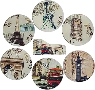 Coralpearl 木製ホルダー付き6ドリンク吸収剤用コースター、ラウンドウッドカップマットセットワインティーコーヒー飲料用ヴィンテージ装飾パッドキッチンオフィスバーテーブルカウンタートップのビール(11cm 都市)