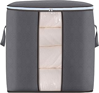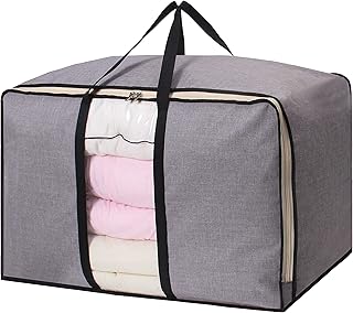 Protecu 大容量 衣類収納バッグ オーガナイザー 補強ハンドル付き 厚い生地 掛け布団 ブランケット 寝具 折りたたみ式 丈夫なジッパー付き クリアウィンドウ (グレー 90L)