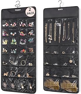 FOREGOER 2個 吊り下げジュエリーオーガナイザー デュアルジッパー付き 43ポケット 360度回転ハンガー 壁ドア 両面 大型ネックレス イヤリングホルダー 靴の装飾チャーム オーガナイザー - ブラック